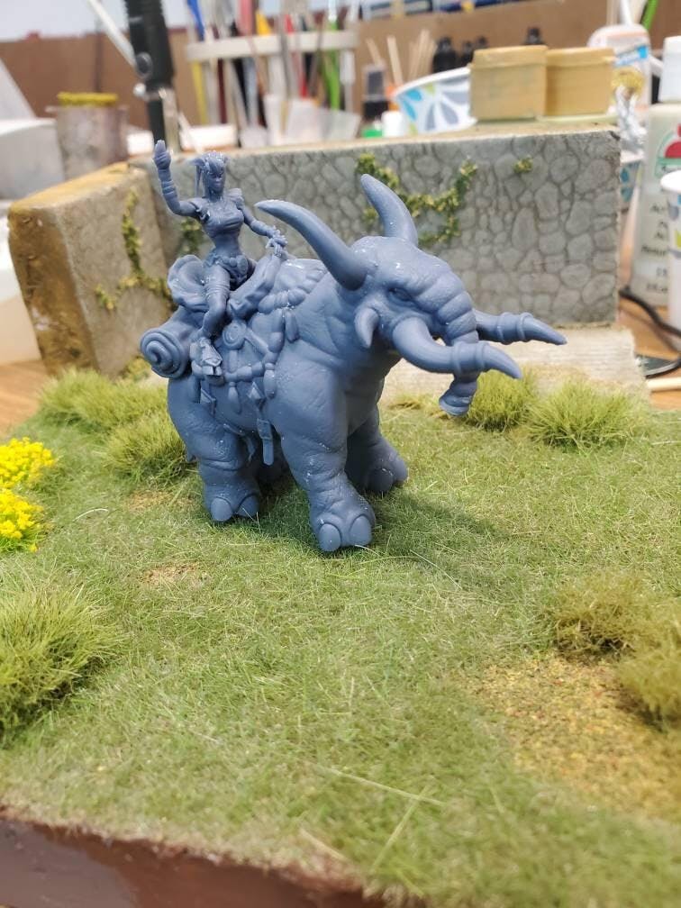 Elephant with Horned Humanoid Rider - Unpainted Miniature